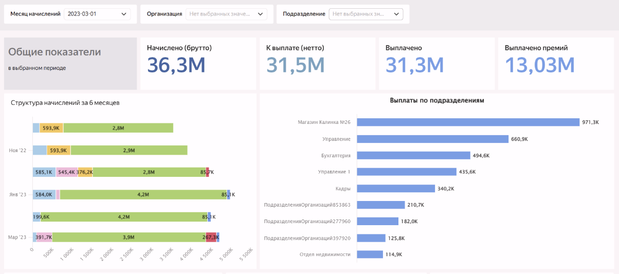Например, видно, что начислено 36,3 млн, к выплате — 31,5 млн, а премии составили 13 млн. В верхнем блоке собраны ключевые показатели — общие суммы начислений, выплат и премий за выбранный период. Ниже — каскадная детализация: диаграммы показывают, из чего складывается ФОТ, как он распределён по месяцам и подразделениям. Зелёная диаграмма отражает разбивку по статьям начислений (оклады, премии, надбавки), что позволяет быстро увидеть, за счёт чего растёт или проседает фонд. Такая визуальная структура помогает не просто смотреть на сумму, а понимать причины изменений — буквально за несколько секунд.